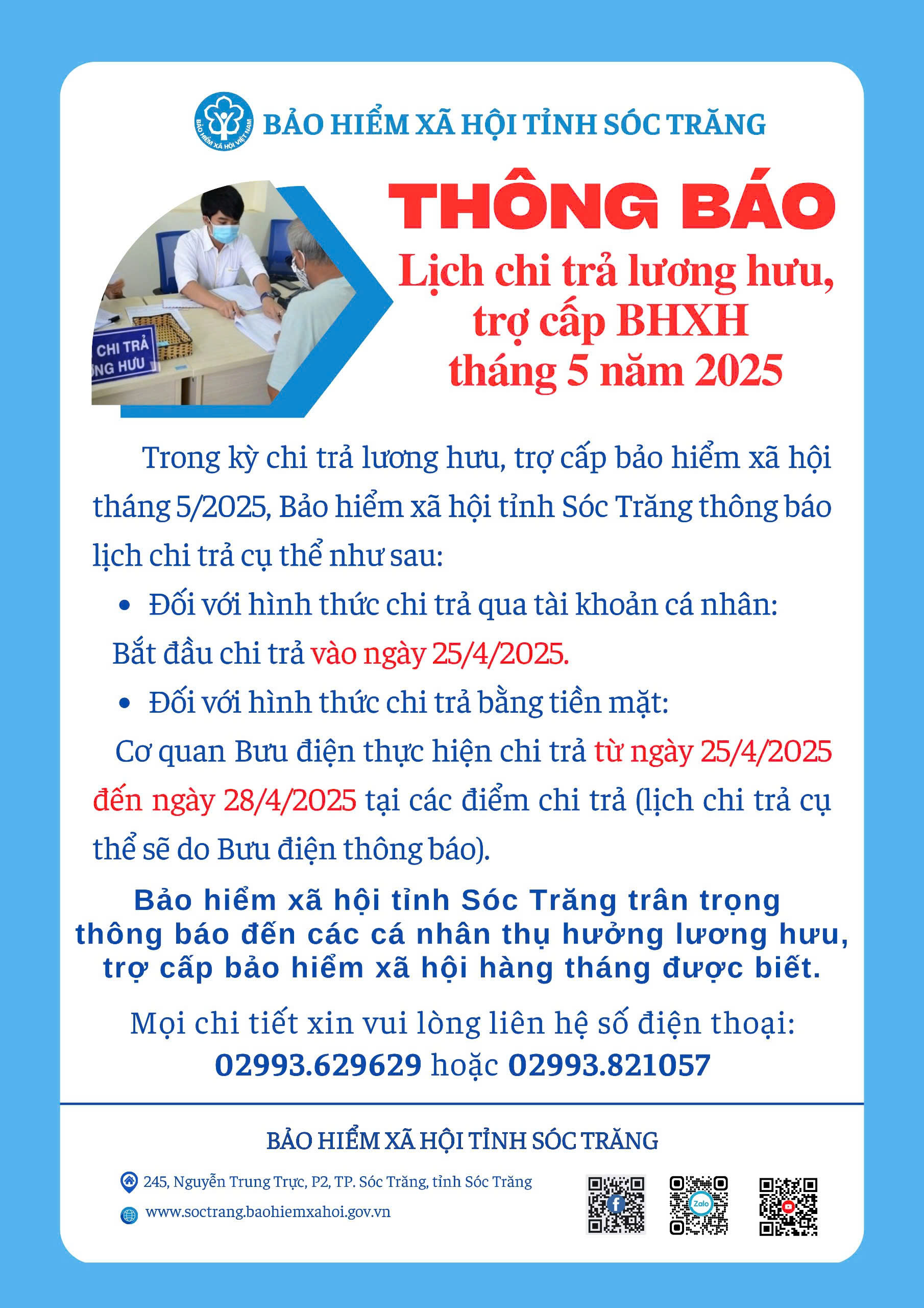 Thông báo Lịch Chi trả lương hưu, trợ cấp BHXH tháng 5 năm 2025