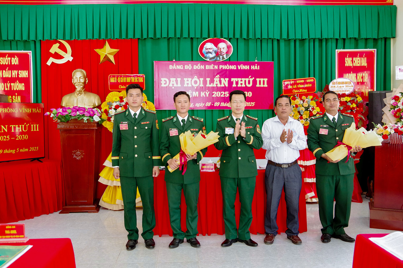 | Lãnh đạo BĐBP tỉnh Sóc Trăng và HĐND thị xã Vĩnh Châu tặng hoa chúc mừng Ban Chấp hành Đảng bộ Đồn Biên phòng Vĩnh Hải nhiệm kỳ 2025 - 2030. |