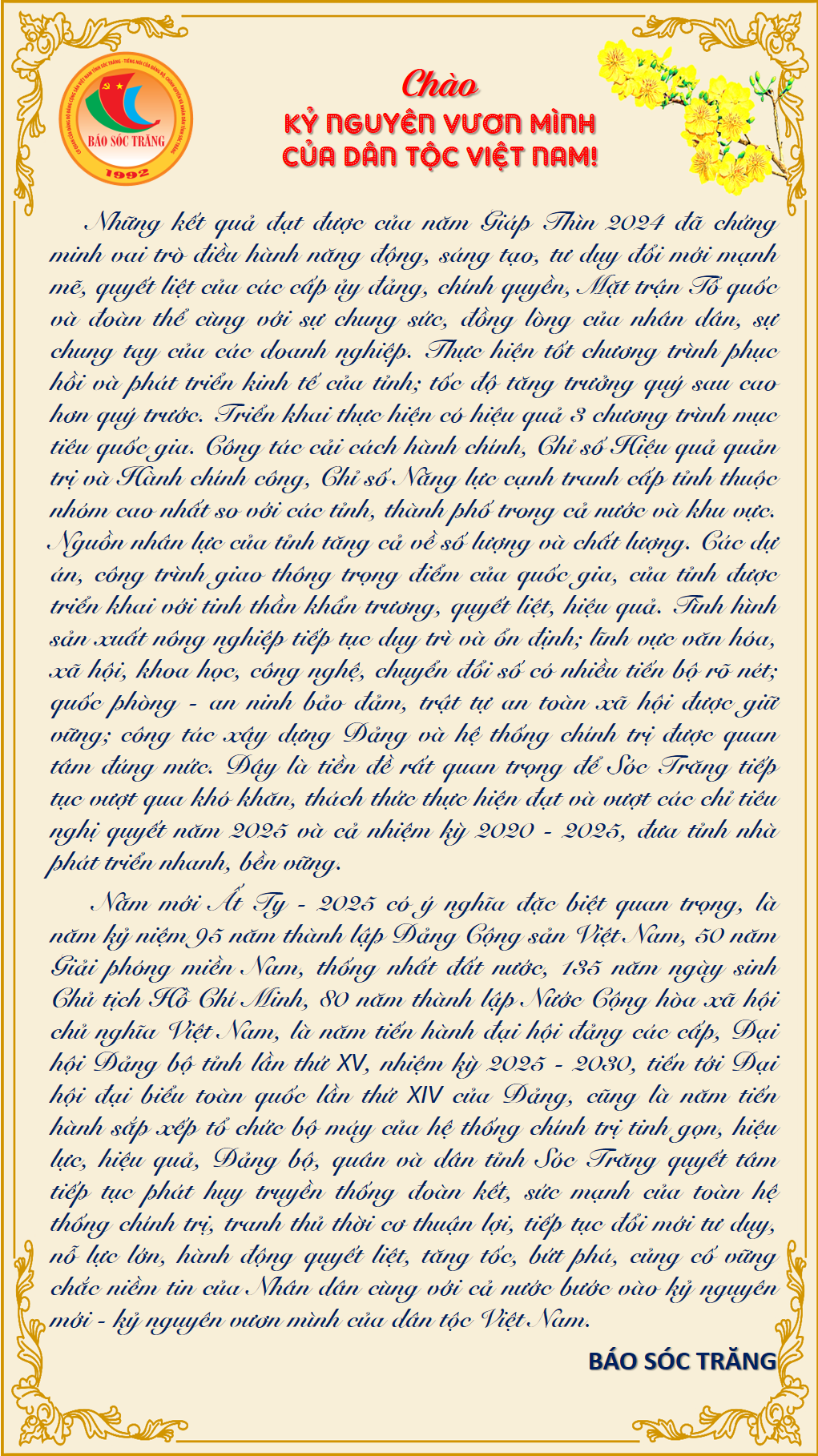 STO - Xuân Ất Tỵ đang về trên khắp mọi miền của Tổ quốc! Một sinh khí mới đang bừng dậy, lan tỏa khắp non sông. Sóc Trăng háo hức bước vào mùa xuân năm 2025 từ những thành tựu trong nhiệm kỳ 2020 - 2025 đã đạt được, tạo khí thế, xung lực mới cho kỷ nguyên vươn mình của dân tộc Việt Nam, với khát vọng xây dựng quê hương Sóc Trăng phát triển, phồn vinh, hạnh phúc, trở thành một trong những tỉnh phát triển khá của vùng đồng bằng sông Cửu Long.