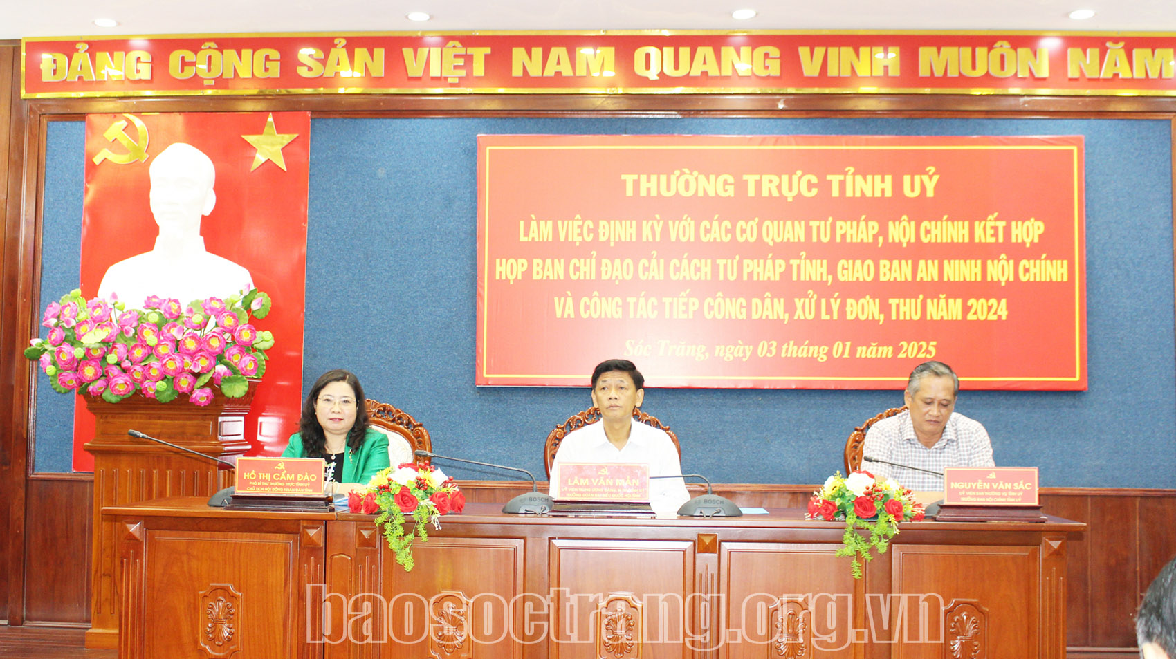 Phát biểu chỉ đạo, đồng chí Lâm Văn Mẫn ghi nhận, đánh giá cao sự nỗ lực, cố gắng và kết quả đạt được của các cơ quan nội chính, Ban Chỉ đạo cải cách tư pháp tỉnh. Đề nghị các cơ quan nội chính và Ban Nội chính Tỉnh ủy tiếp tục quán triệt, tham mưu, triển khai thực hiện có hiệu quả các chủ trương, quy định của Đảng, pháp luật của Nhà nước về công tác nội chính, phòng, chống tham nhũng, lãng phí, tiêu cực và cải cách tư pháp, trọng tâm là nội dung chỉ đạo của đồng chí Tô Lâm - Tổng Bí thư Ban Chấp hành Trung ương Đảng tại Hội nghị tổng kết công tác ngành Nội chính Đảng và hoạt động của Ban Chỉ đạo phòng, chống tham nhũng, lãng phí, tiêu cực cấp tỉnh năm 2024, phương hướng, nhiệm vụ năm 2025 vừa được tổ chức vào ngày 31/12/2024. Đặc biệt là việc tiếp tục củng cố, kiện toàn tổ chức bộ máy, xây dựng đội ngũ cán bộ ngành Nội chính Đảng thật sự "chắc - sắc - đắc”.