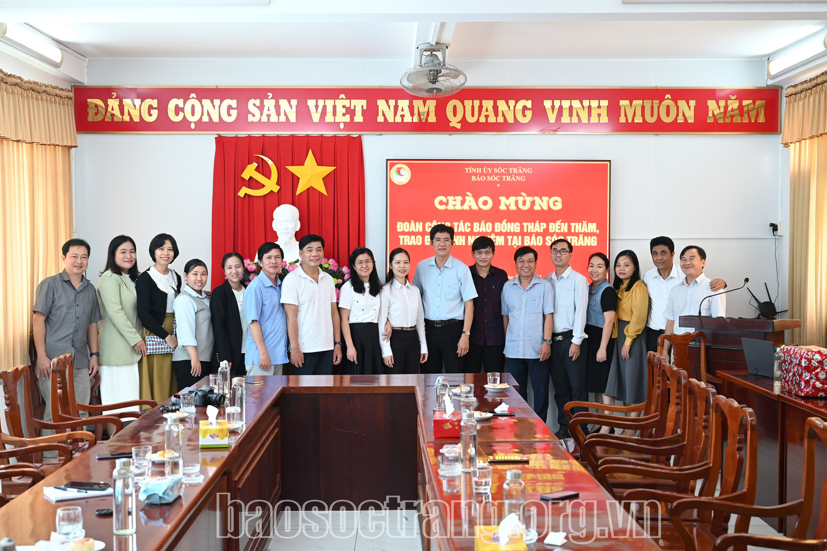 | Đoàn công tác Báo Đồng Tháp chụp ảnh lưu niệm với Ban Biên tập và lãnh đạo các phòng chuyên môn của Báo Sóc Trăng. Ảnh: TẤN PHÁT |