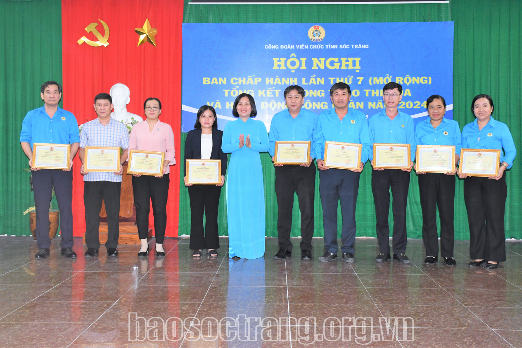 | Đồng chí Trịnh Thị Bảo Khuyên - Phó Chủ tịch Liên đoàn Lao động tỉnh Sóc Trăng trao tặng giấy khen cho các tập thể. Ảnh: HẢI HÀ |