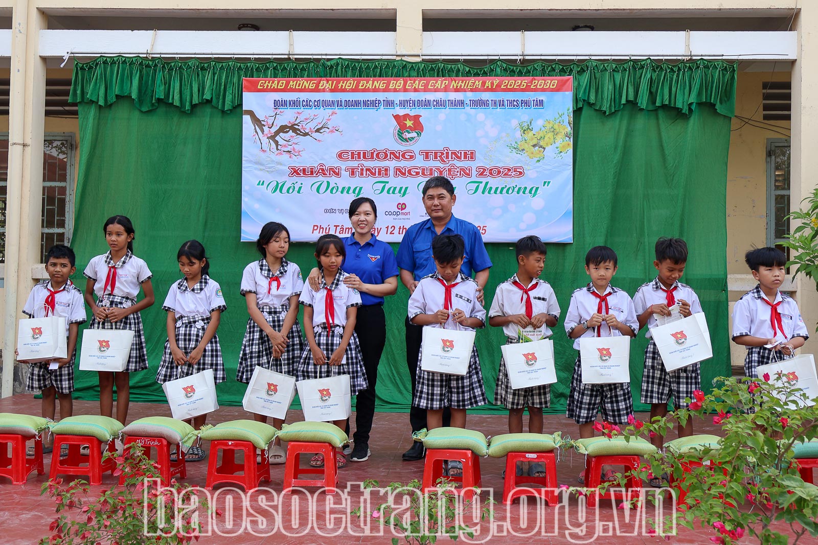 | Lãnh đạo Đoàn Khối các cơ quan và doanh nghiệp tỉnh Sóc Trăng và Huyện đoàn Châu Thành trao quà cho các em học sinh. Ảnh: NGỌC HẢI |