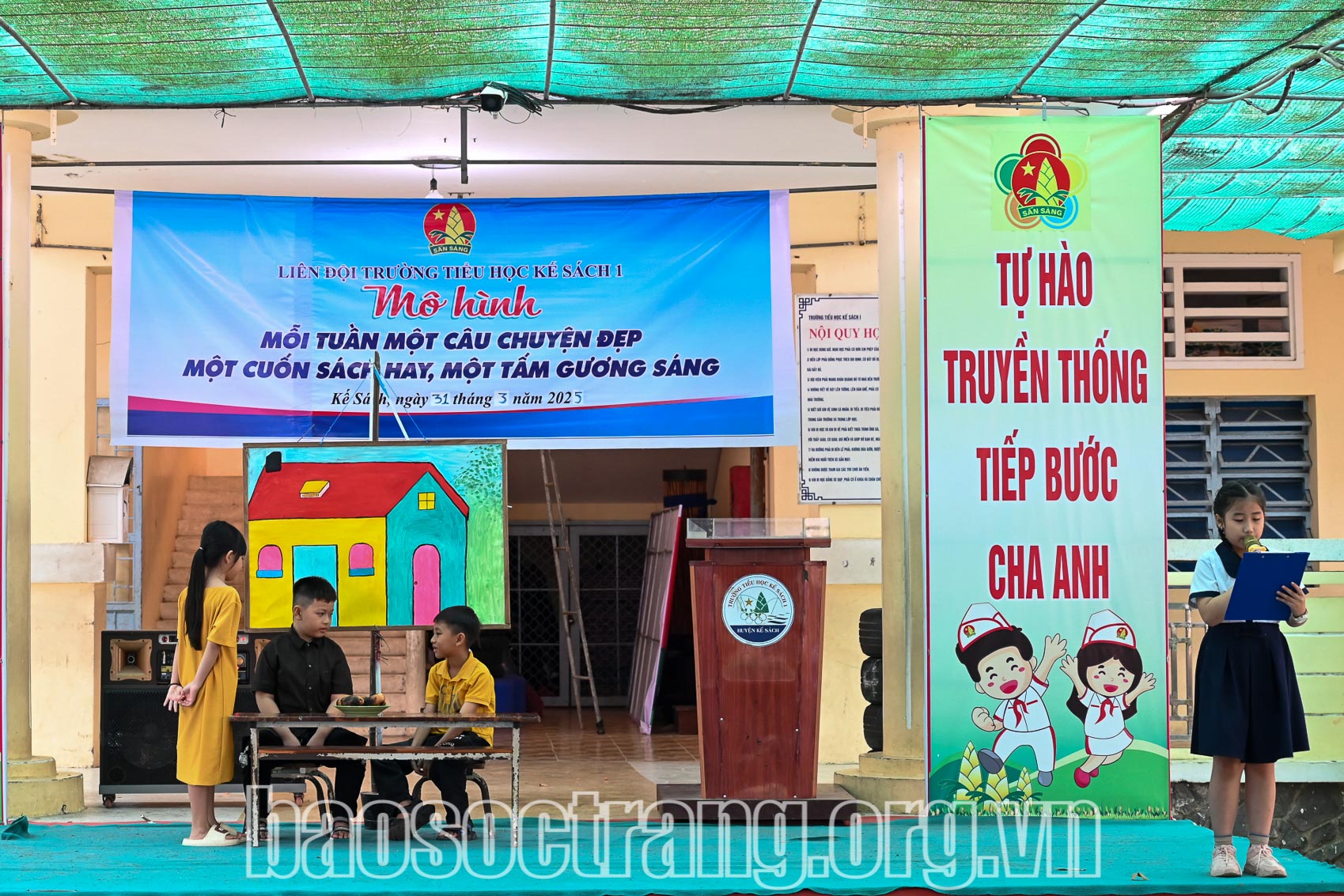 Liên đội Trường Tiểu học Kế Sách 1 (huyện Kế Sách) là một trong những liên đội được Hội đồng Đội tỉnh đánh giá cao trong thực hiện mô hình Mỗi tuần một câu chuyện đẹp, một cuốn sách hay, một tấm gương sáng. Mô hình được liên đội trường triển khai lồng ghép vào tiết sinh hoạt dưới cờ sáng thứ Hai. Thay vì chỉ đọc và nghe, Liên đội trường đã tạo điều kiện cho các em học sinh tham gia diễn các tiểu phẩm, sử dụng hình ảnh minh họa để tăng độ sinh động, thu hút. Sau khi trình bày các câu chuyện, các em học sinh đã liên hệ thực tế bản thân và rút ra những bài học ý nghĩa, đồng thời có những câu hỏi đố vui có thưởng cho các bạn theo dõi bên dưới. Bằng cách làm đó đã tạo sự hứng khởi, sôi động cho tiết sinh hoạt dưới cờ của các em học sinh.