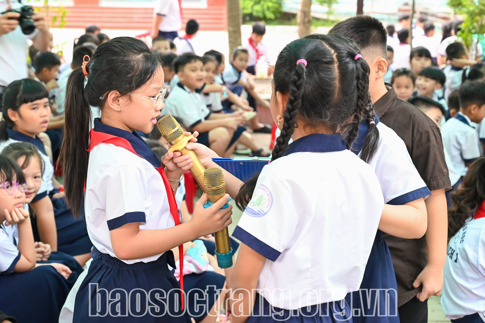 | Liên đội Trường Tiểu học Kế Sách 1, huyện Kế Sách (Sóc Trăng) thực hiện mô hình Mỗi tuần một câu chuyện đẹp, một cuốn sách hay, một tấm gương sáng lồng ghép vào tiết sinh hoạt dưới cờ. Ảnh: TẤN PHÁT |