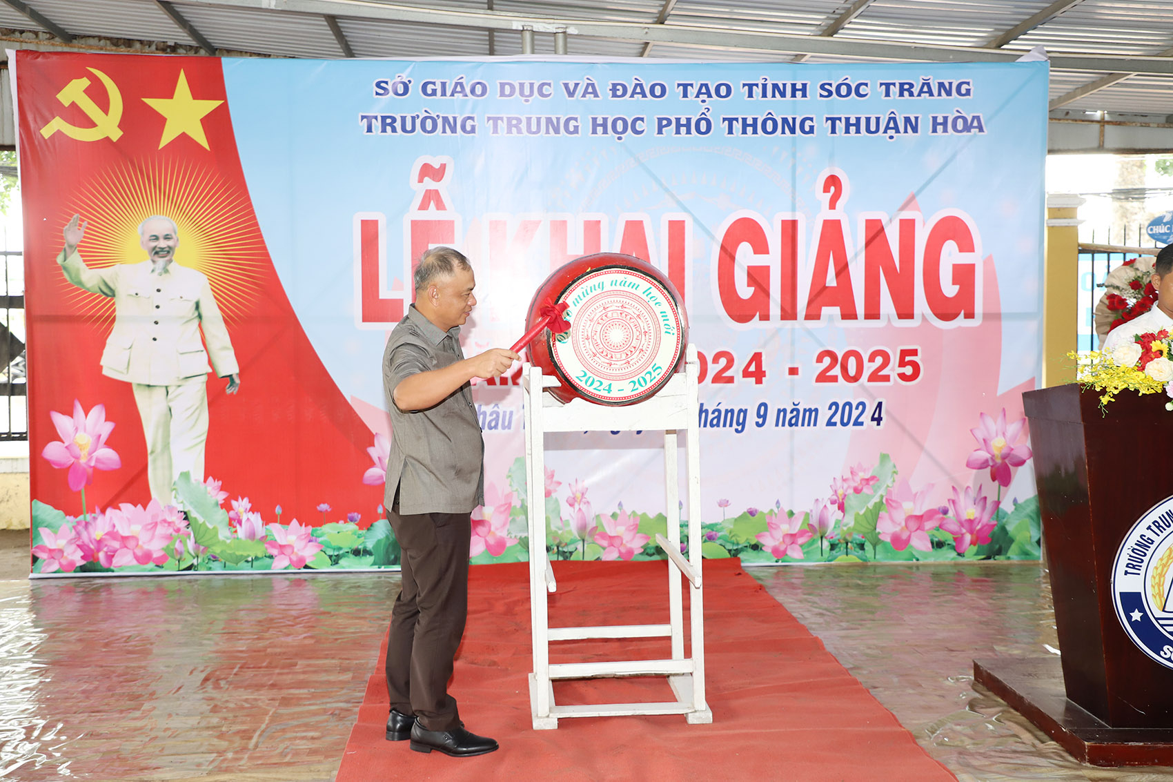 | Đồng chí Nguyễn Văn Thống - Ủy viên Ban Thường vụ Tỉnh ủy, Chủ nhiệm Ủy ban Kiểm tra Tỉnh ủy Sóc Trăng đánh trống khai giảng năm học mới. Ảnh: TẤN PHÁT |