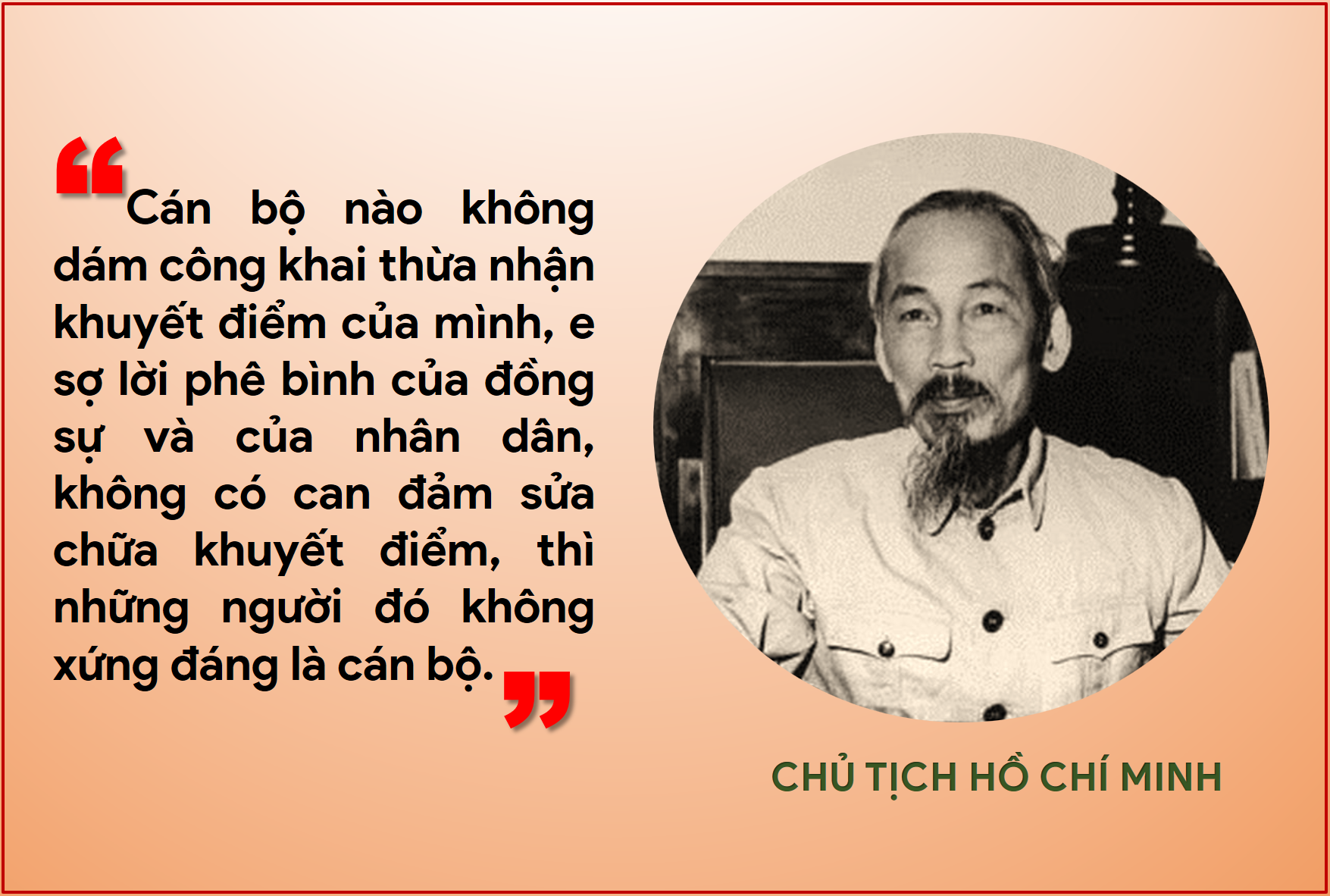 Theo Bác, cán bộ nào không dám công khai thừa nhận khuyết điểm của mình, e sợ lời phê bình của đồng sự và của nhân dân, không có can đảm sửa chữa khuyết điểm, thì những người đó không xứng đáng là cán bộ.