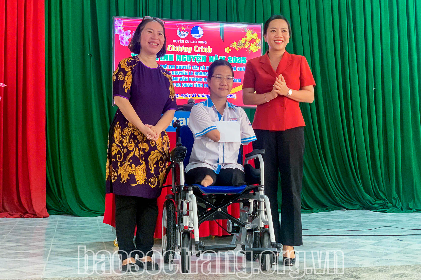 Tại chương trình, Tỉnh đoàn, nhà hảo tâm Nguyễn Lê Hoàng Quỳnh đã trao 20 phần quà, trong đó 10 phần quà cho gia đình có hoàn cảnh khó khăn, 10 phần quà cho các em học sinh vượt khó học tốt. Đồng thời, chị Nguyễn Lê Hoàng Quỳnh còn trao tặng 1 xe lăn điện cho em Trần Thị Hiếu Thảo - học sinh lớp 9A1, Trường Trung học cơ sở An Thạnh 2. Chương trình Xuân tình nguyện năm 2025 tại xã An Thạnh 2 nhằm phát huy vai trò xung kích, tình nguyện của tuổi trẻ trong công tác chăm lo, hỗ trợ Tết cho các gia đình, học sinh có hoàn cảnh khó khăn, học sinh khuyết tật tại địa phương.