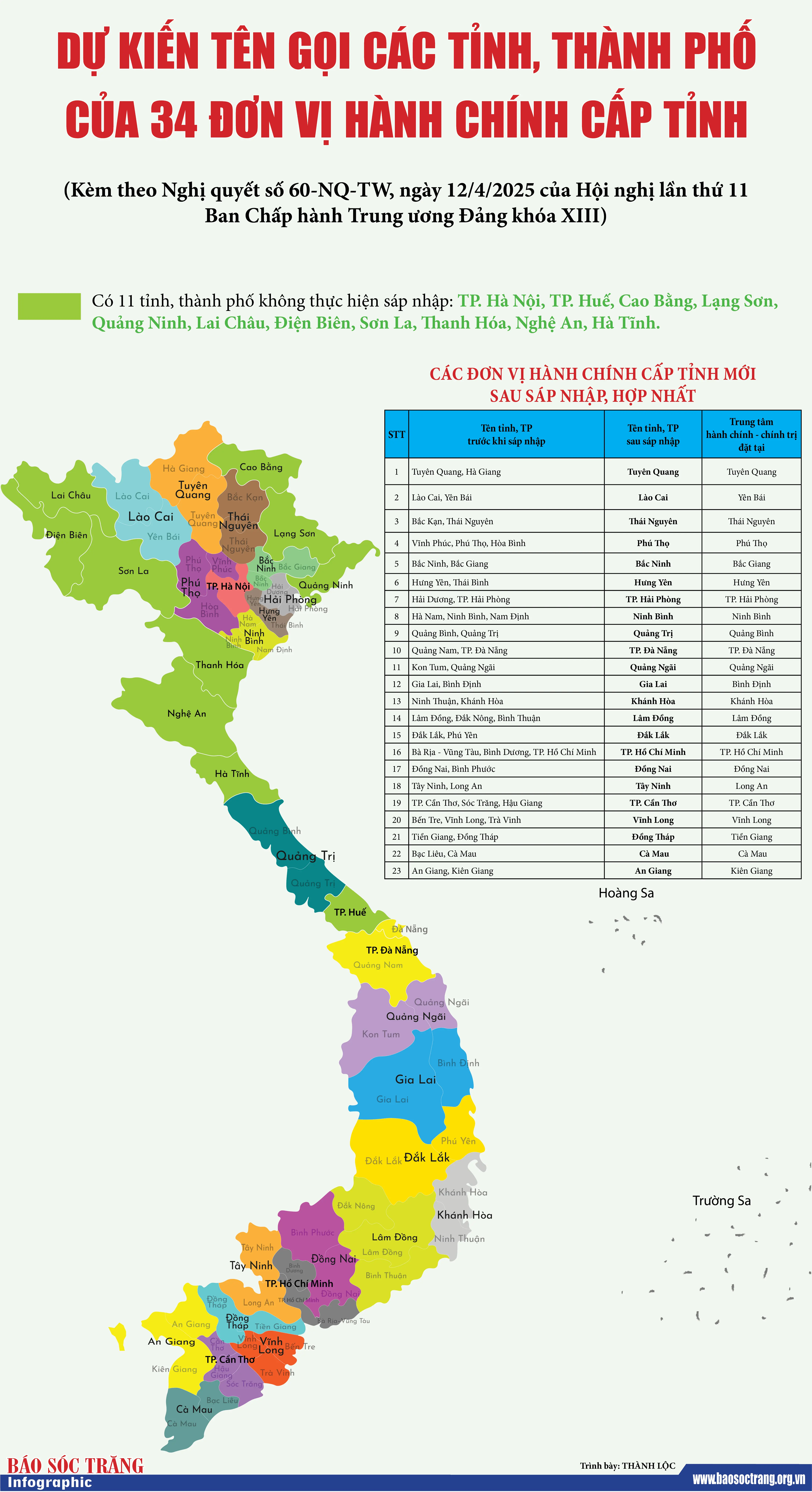 STO - Tên gọi dự kiến của các tỉnh, thành phố và nơi đặt trung tâm chính trị - hành chính sau sáp nhập, hợp nhất (Kèm theo Nghị quyết số 60-NQ/TW, ngày 12/4/2025 của Hội nghị lần thứ 11 Ban Chấp hành Trung ương Đảng khóa XIII).