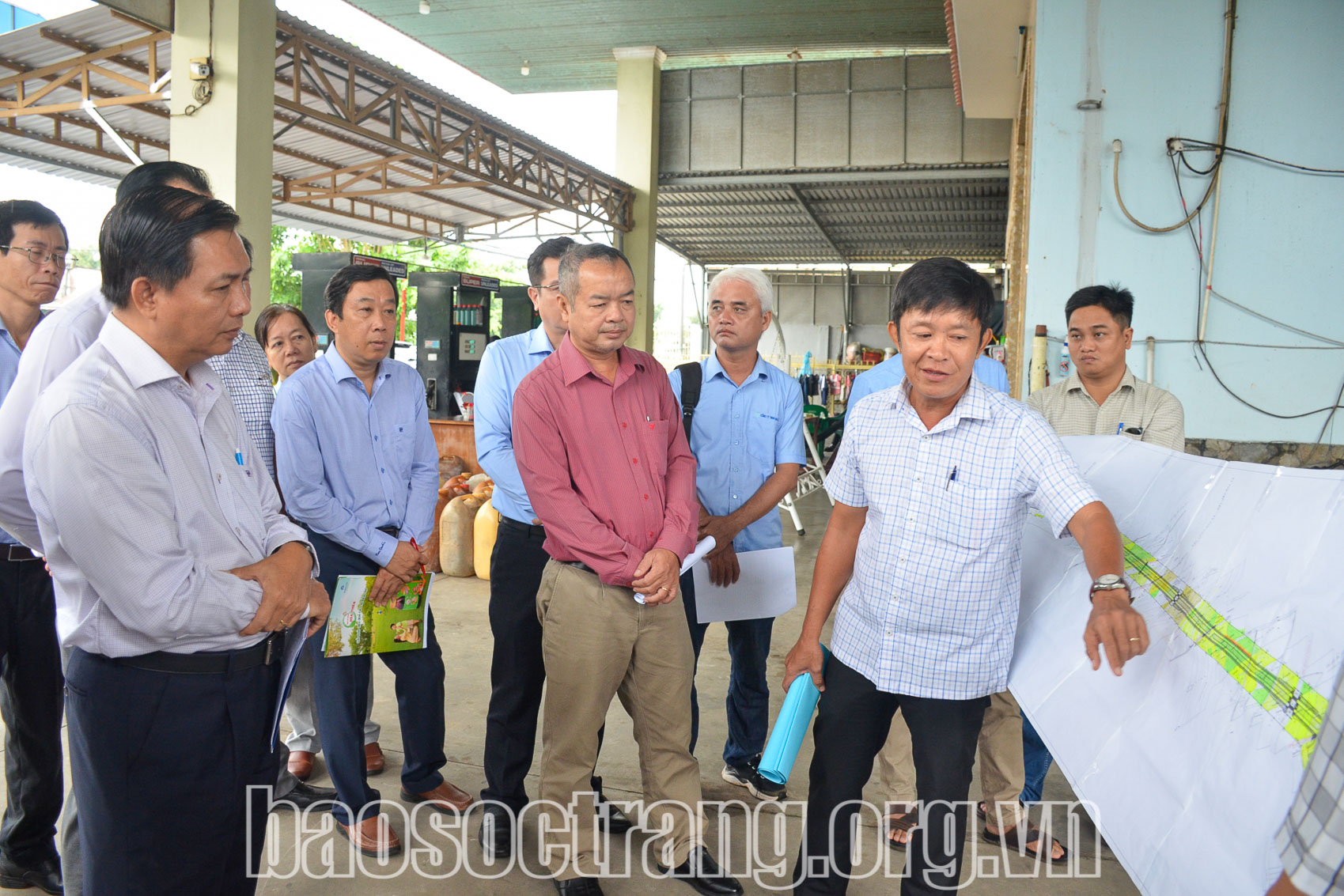| Đồng chí Trần Văn Lâu - Phó Bí thư Tỉnh ủy, Chủ tịch UBND tỉnh Sóc Trăng (bìa trái) và các thành viên đoàn kiểm tra nghe báo cáo khó khăn thực hiện Dự án Đường Vành đai II. Ảnh: HOÀNG LAN |