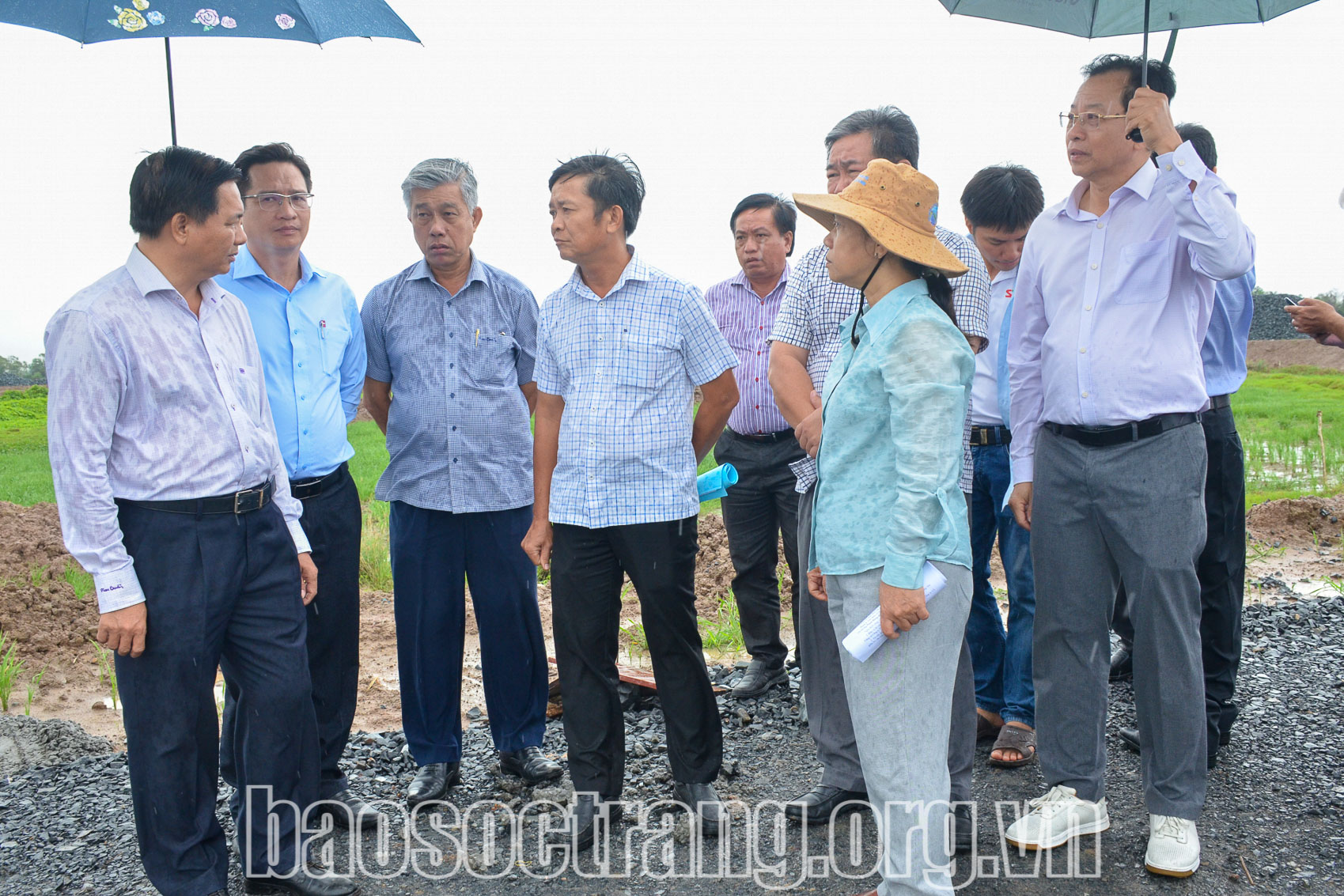| Lãnh đạo UBND tỉnh và các sở, ban ngành tỉnh, UBND thành phố Sóc Trăng kiểm tra thực tế tại Dự án Đường Vành đai I. Ảnh: HOÀNG LAN |