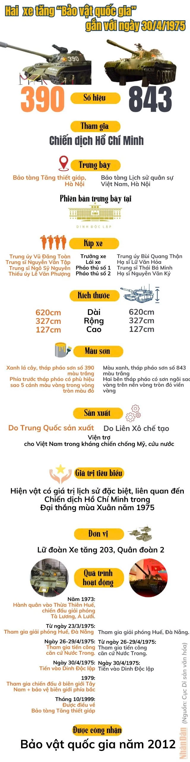 NDO - Xe tăng T59 số hiệu 390 và xe tăng T54B số hiệu 843 là hai chiếc xe đã húc đổ cánh cổng của Dinh Độc Lập vào trưa ngày 30/4/1975. Đây là hai hiện vật có ý nghĩa lịch sử đặc biệt, gắn liền với Chiến dịch Hồ Chí Minh trong Đại thắng mùa Xuân 1975, cùng được công nhận Bảo vật quốc gia năm 2012.