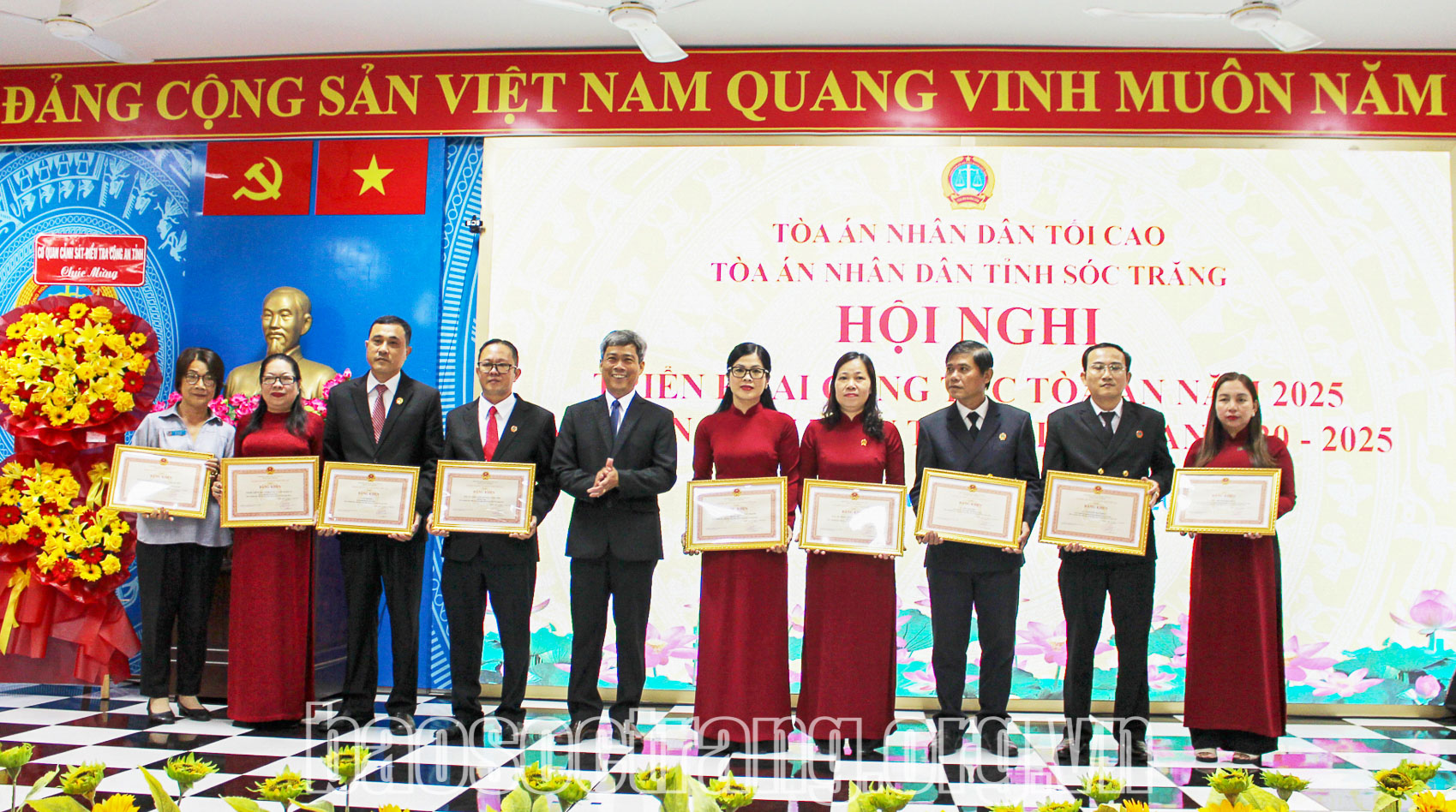 | Đại diện lãnh đạo Văn phòng TAND tỉnh (thứ 4 từ trái sang) nhận bằng khen TAND Tối cao. Ảnh: SỚM MAI |