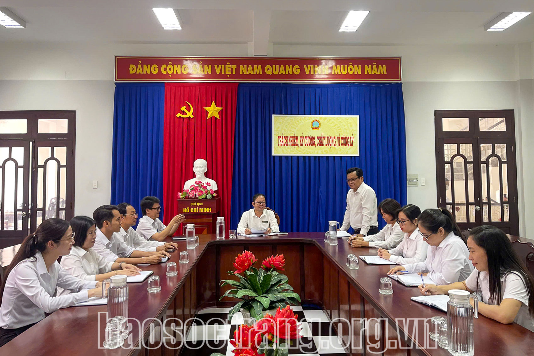| Văn phòng TAND tỉnh Sóc Trăng thường xuyên họp, trao đổi thông tin, đề ra nhiều sáng kiến trong thực hiện nhiệm vụ. Ảnh: SỚM MAI |