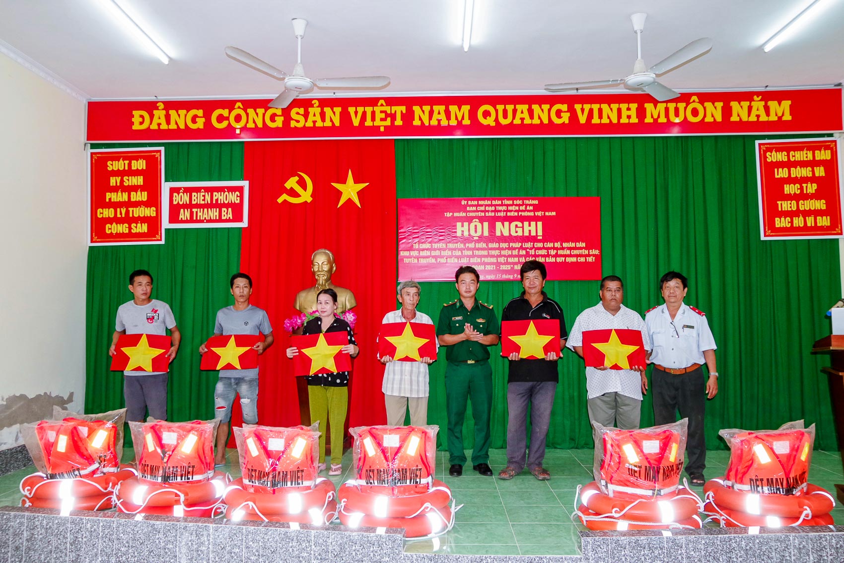 | Đồn Biên phòng An Thạnh Ba, BĐBP tỉnh Sóc Trăng trao tặng cờ Tổ quốc và phao cứu sinh cho các ngư dân tại Hội nghị tuyên truyền Luật Biên phòng Việt Nam được tổ chức tại đơn vị. |