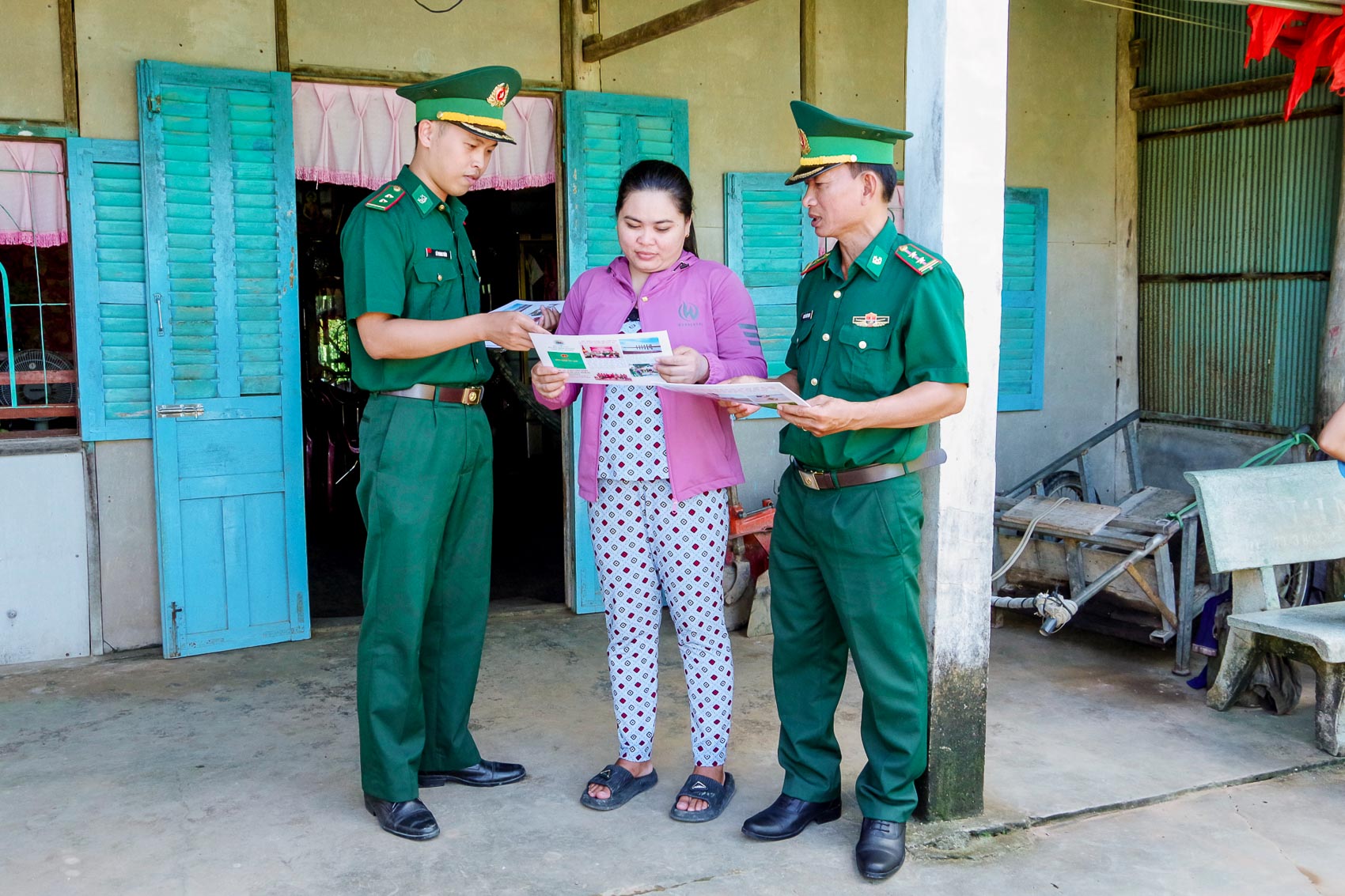 | Cán bộ Đồn Biên phòng Lai Hòa, BĐBP tỉnh Sóc Trăng trực tiếp đến địa bàn phát tờ rơi tuyên truyền Luật Biên phòng Việt Nam cho người dân. |