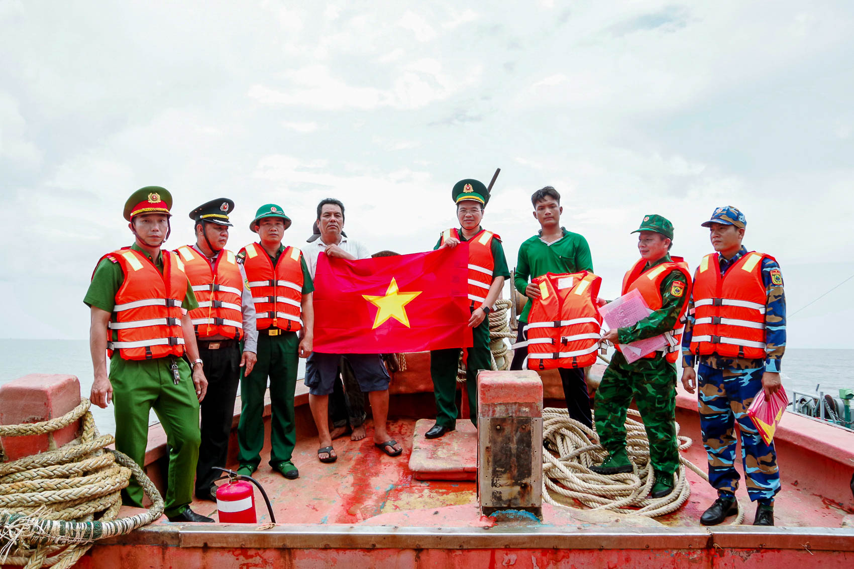 | BĐBP tỉnh Sóc Trăng thường xuyên phối hợp với các lực lượng chức năng tuần tra, kiểm soát trên biển kết hợp tuyên truyền phòng, chống khai thác IUU, Luật Biên phòng Việt Nam và trao tặng cờ Tổ quốc, áo phao cho ngư dân. |