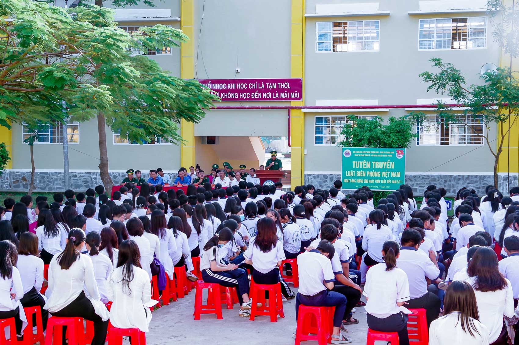 | Đồn Biên phòng Trung Bình, BĐBP tỉnh Sóc Trăng phối hợp với các trường trên địa bàn tổ chức tuyên truyền Luật Biên phòng Việt Nam cho các em học sinh. |