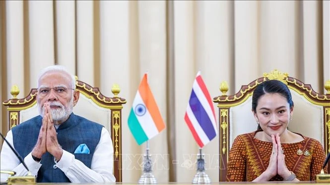| Thủ tướng Thái Lan Paetongtam Shinawata và Thủ tướng Ấn Độ Narendra Modi tại cuộc gặp ở thủ đô Bangkok, Thái Lan ngày 3/4/2025. (Ảnh: ANI/TTXVN) |