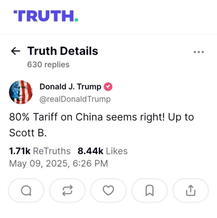 “Thuế quan 80% đối với Trung Quốc có vẻ đúng! Tùy thuộc vào Scott B”, Tổng thống Trump viết trong một bài đăng trên Truth Social. Bộ trưởng Tài chính Scott Bessent là một trong những thành viên đàm phán với người đồng cấp từ Trung Quốc tại các cuộc họp ở Thụy Sĩ vào cuối tuần này.