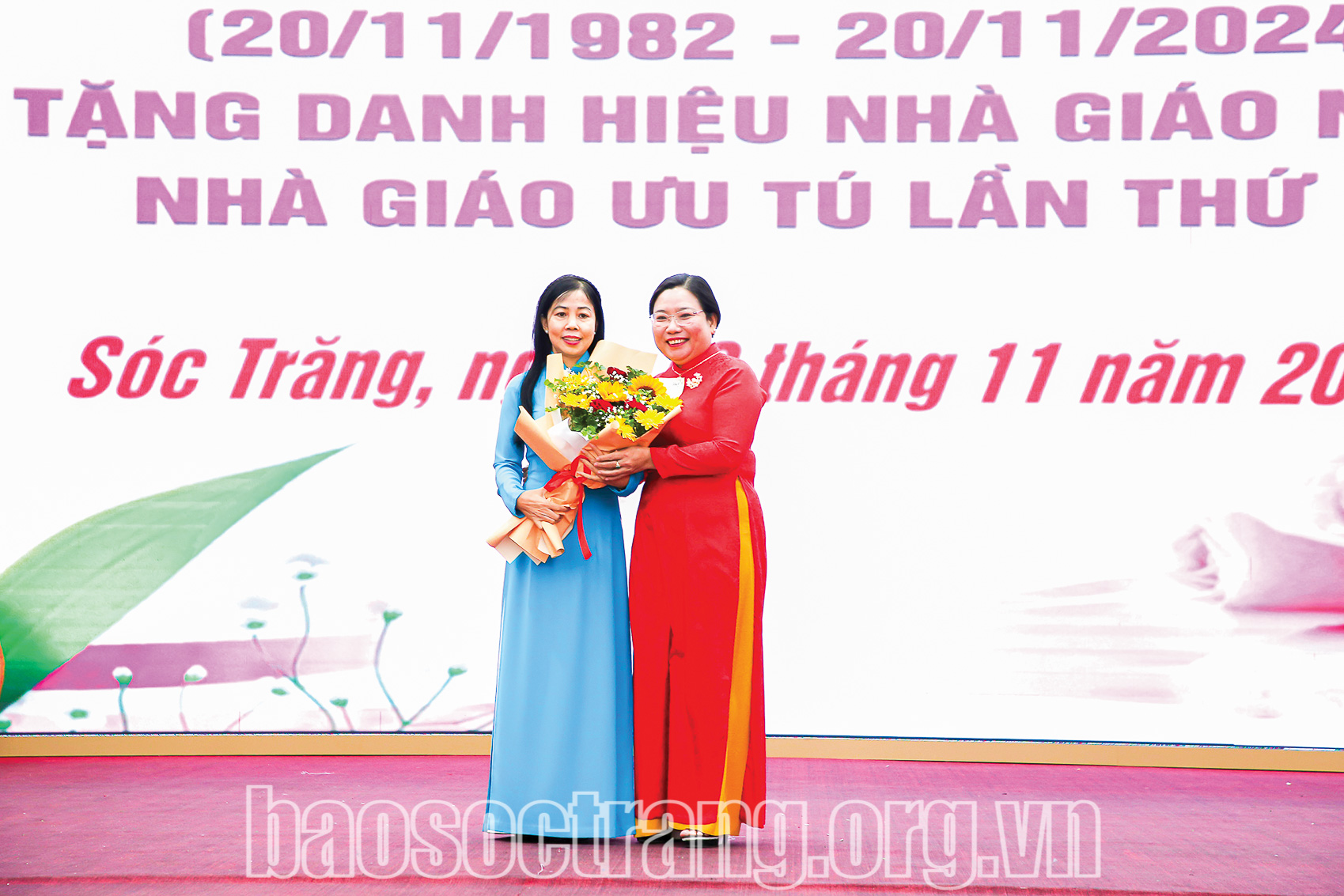 | Phó Bí thư Thường trực Tỉnh ủy, Chủ tịch HĐND tỉnh Sóc Trăng Hồ Thị Cẩm Đào (bìa phải) tặng hoa chúc mừng cô Đỗ Thị Hồi được phong tặng danh hiệu Nhà giáo Nhân dân. Ảnh: HUỲNH NHƯ |