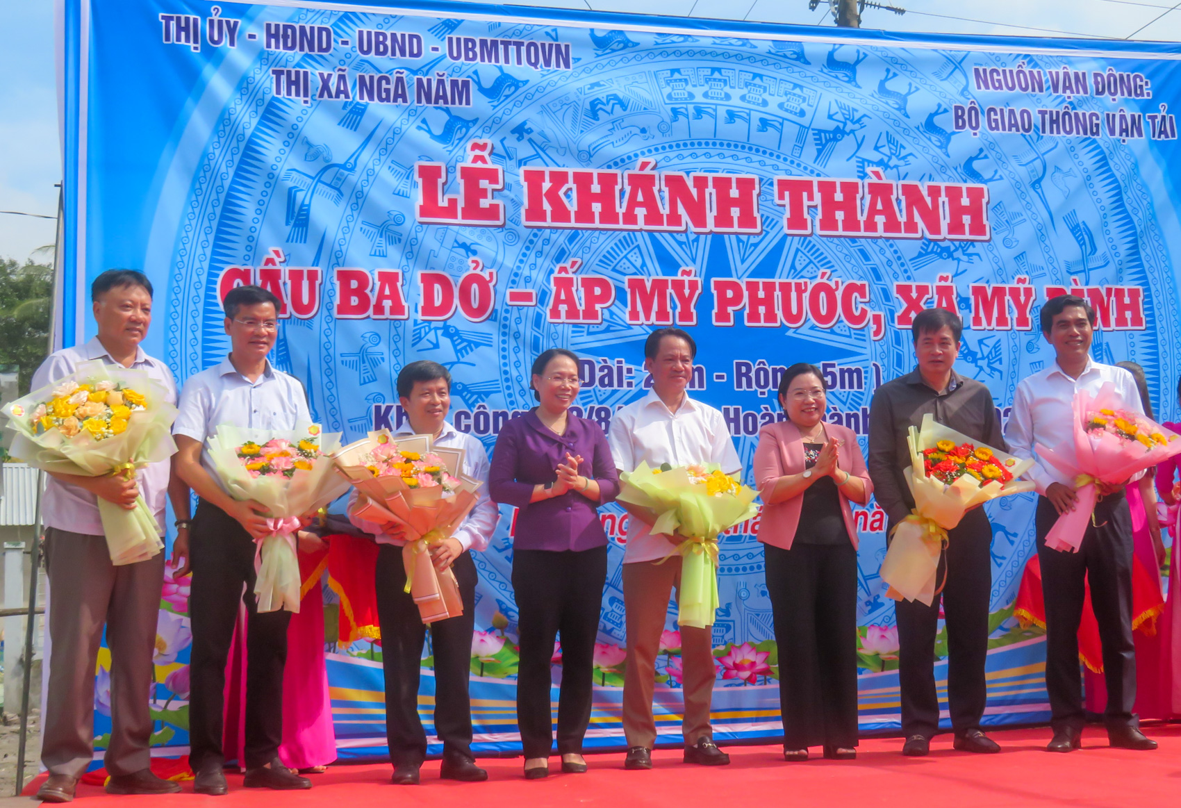 | Các đồng chí lãnh đạo tỉnh Sóc Trăng và thị xã Ngã Năm dự lễ khánh thành cây cầu Ba Dở. |