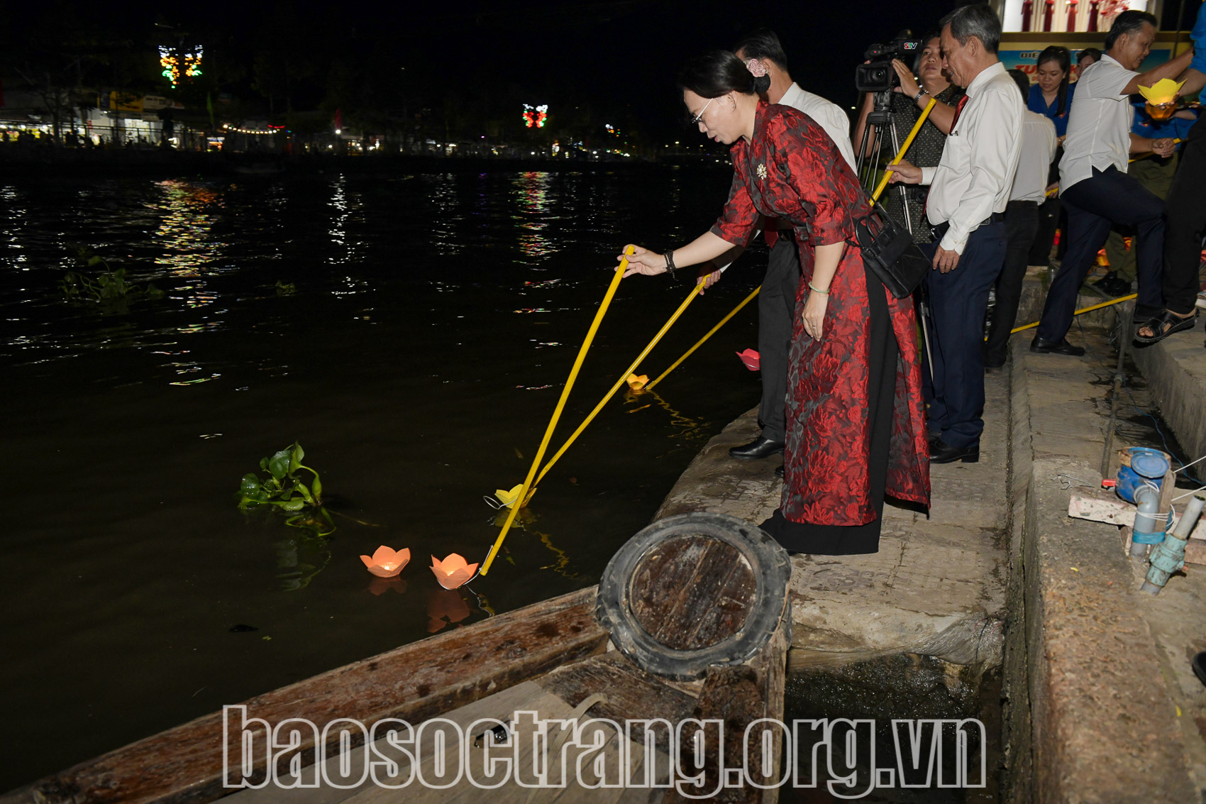 | Điểm nhấn ấn tượng mừng Đảng, mừng Xuân ở thị xã năm nay là tổ chức thả đèn hoa đăng tại dòng sông, đoạn bờ kè 5 nhánh sông, thuộc Phường 1 (thị xã Ngã Năm) và chương trình văn nghệ mừng Đảng, mừng xuân Ất Tỵ kết hợp bắn pháo hoa đêm giao thừa. Ảnh: CHÍ BẢO |