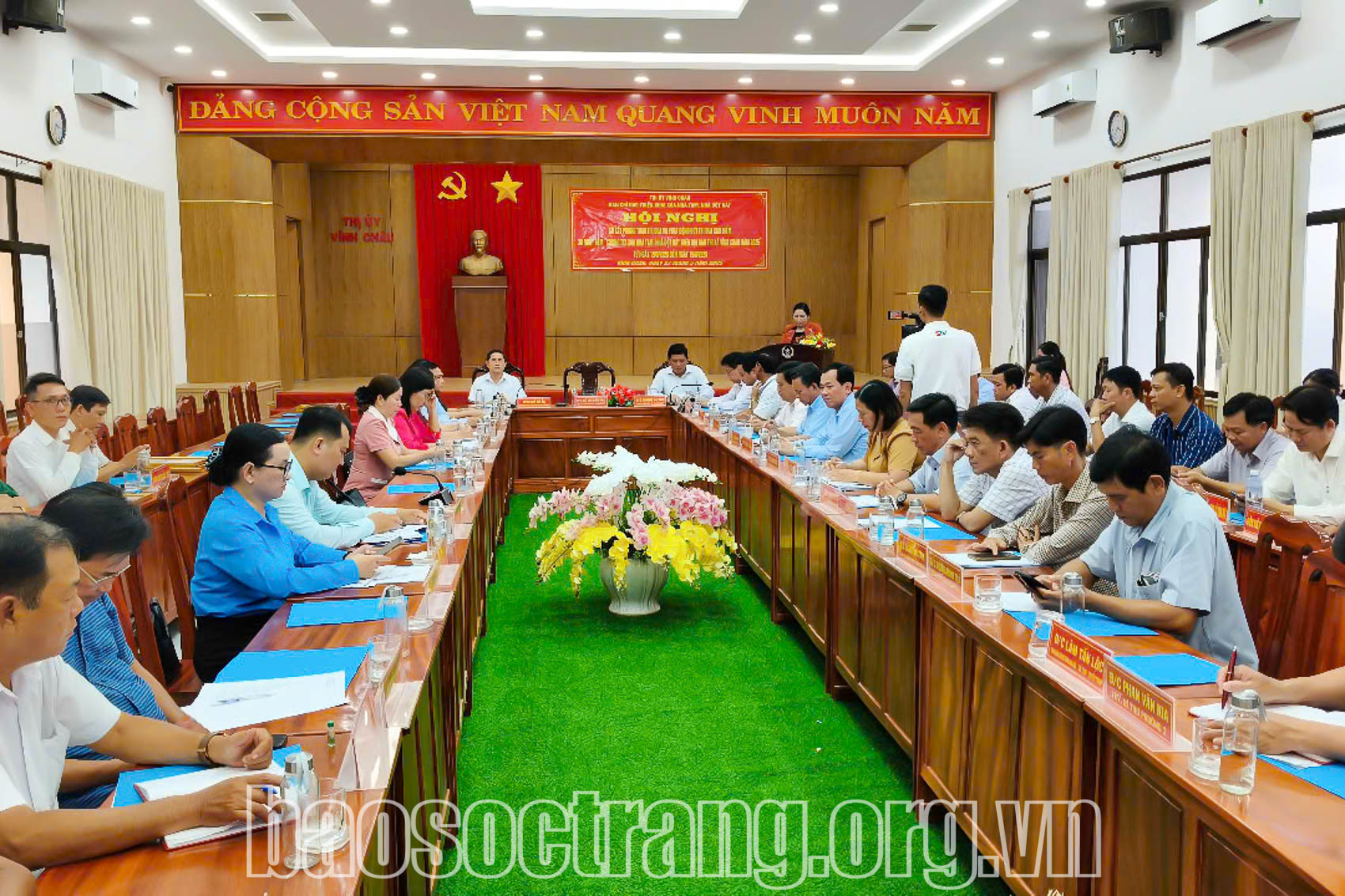 | Quang cảnh Hội nghị sơ kết phong trào thi đua và phát động đợt thi đua cao điểm 30 ngày đêm “Chung tay xóa nhà tạm, nhà dột nát” tại thị xã Vĩnh Châu (Sóc Trăng). |