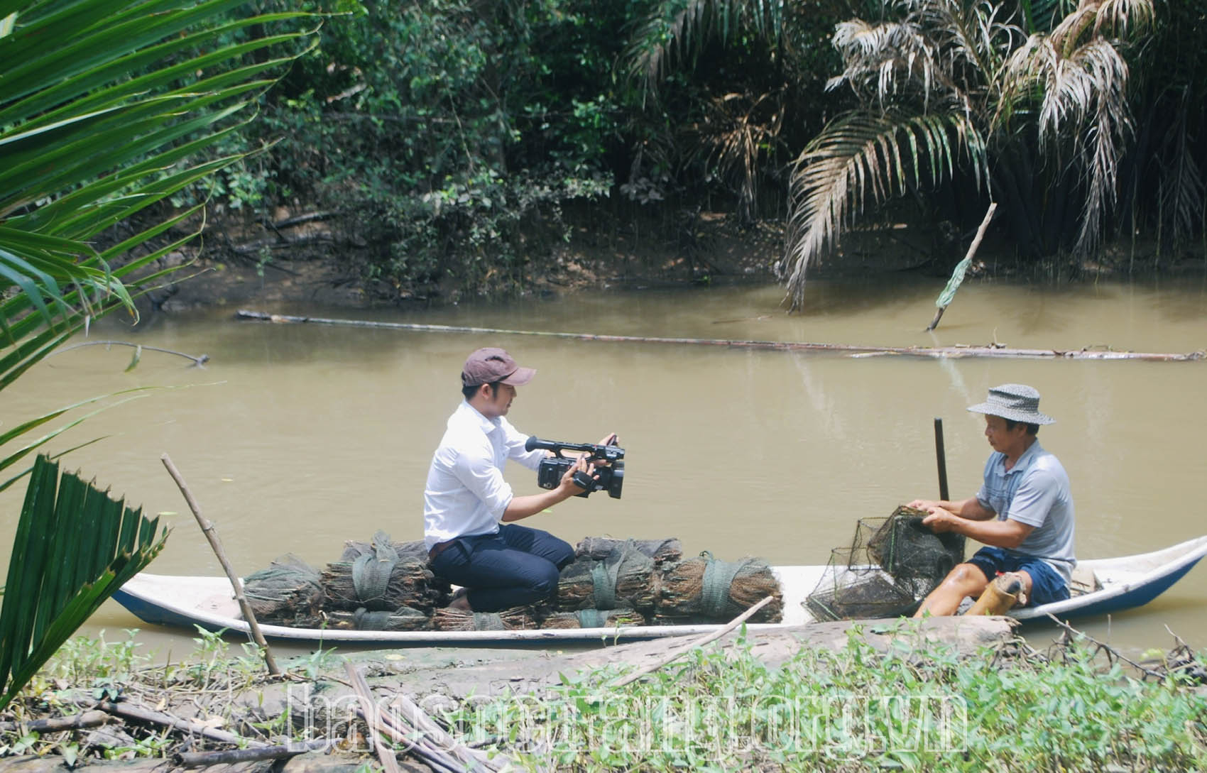 | Phóng viên Trung tâm Văn hóa - Thể thao - Truyền thanh huyện Mỹ Xuyên (Sóc Trăng) tác nghiệp thực địa. Ảnh: HOÀNG LAN |