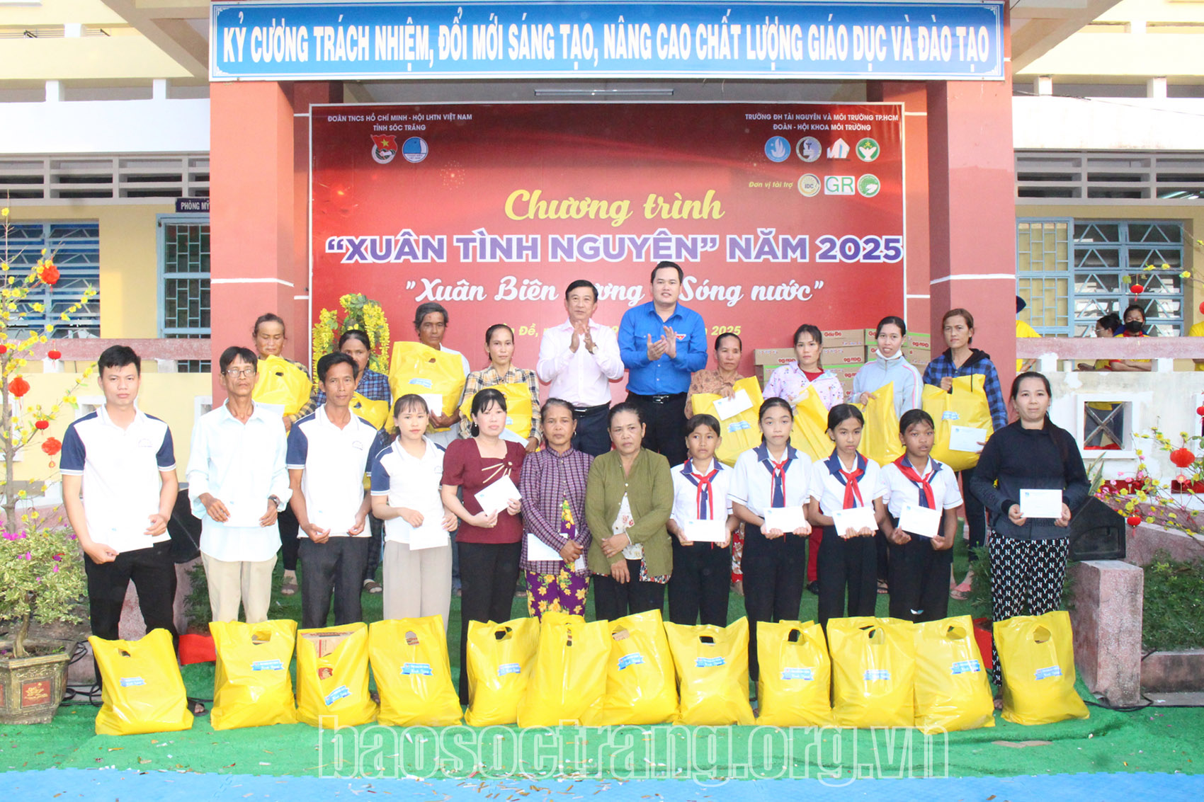 Năm nay, với sự đồng hành của Trường Đại học Tài nguyên và Môi trường Thành phố Hồ Chí Minh, chương trình Xuân tình nguyện được chọn tổ chức tại xã Lịch Hội Thượng, huyện Trần Đề. Trong khuôn khổ chương trình, Ban Thường vụ Tỉnh đoàn phối hợp cùng Trường Đại học Tài nguyên và Môi trường Thành phố Hồ Chí Minh tặng 240 phần quà Tết cho gia đình chính sách, người dân, công nhân và học sinh có hoàn cảnh khó khăn; gói 150 đòn bánh tét tặng người dân, tổ chức 8 gian hàng: trò chơi dân gian, quần áo không đồng, ẩm thực, quà tặng…) phục vụ học sinh trên địa bàn; hỗ trợ 1.000 cây xanh; ra quân chiến dịch hãy làm sạch biển; tổ chức Chương trình giao lưu Mùa xuân biên giới năm 2025… tổng kinh phí tổ chức trên 200 triệu đồng.