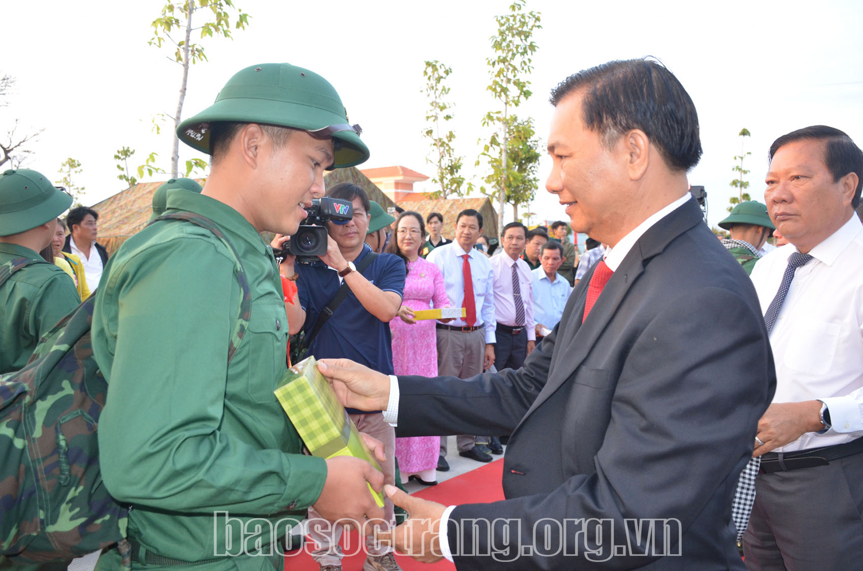 Đồng chí Hồ Thị Cẩm Đào - Phó Bí thư Thường trực Tỉnh ủy, Chủ tịch HĐND tỉnh Sóc Trăng tặng quà động viên thanh niên lên đường nhập ngũ. Ảnh: MỸ LINH