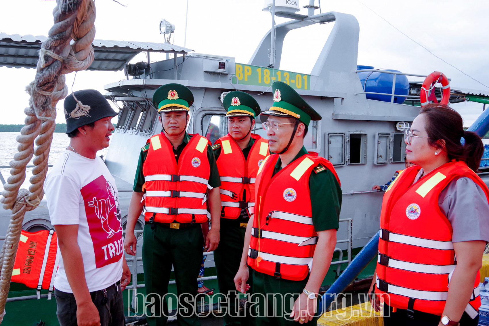 | Lãnh đạo Bộ đội Biên phòng tỉnh Sóc Trăng thăm hỏi tình hình đánh bắt thủy sản của ngư dân. Ảnh: SONG LÊ |