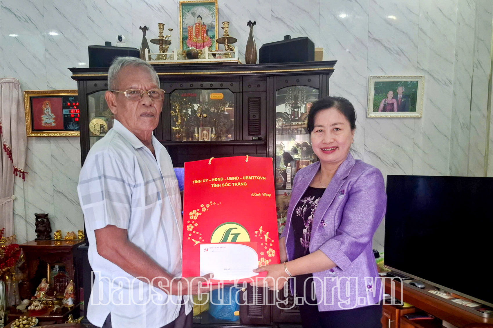 | Đồng chí Dương Thị Kim Thúy - Tỉnh ủy viên, Phó Trưởng Ban Thường trực Ban Tuyên giáo và Dân vận Tỉnh ủy Sóc Trăng tặng quà và chúc Tết đồng chí Kim Sơn - nguyên Giám đốc Sở Giáo dục và Đào tạo. Ảnh: THẠCH PÍCH |
