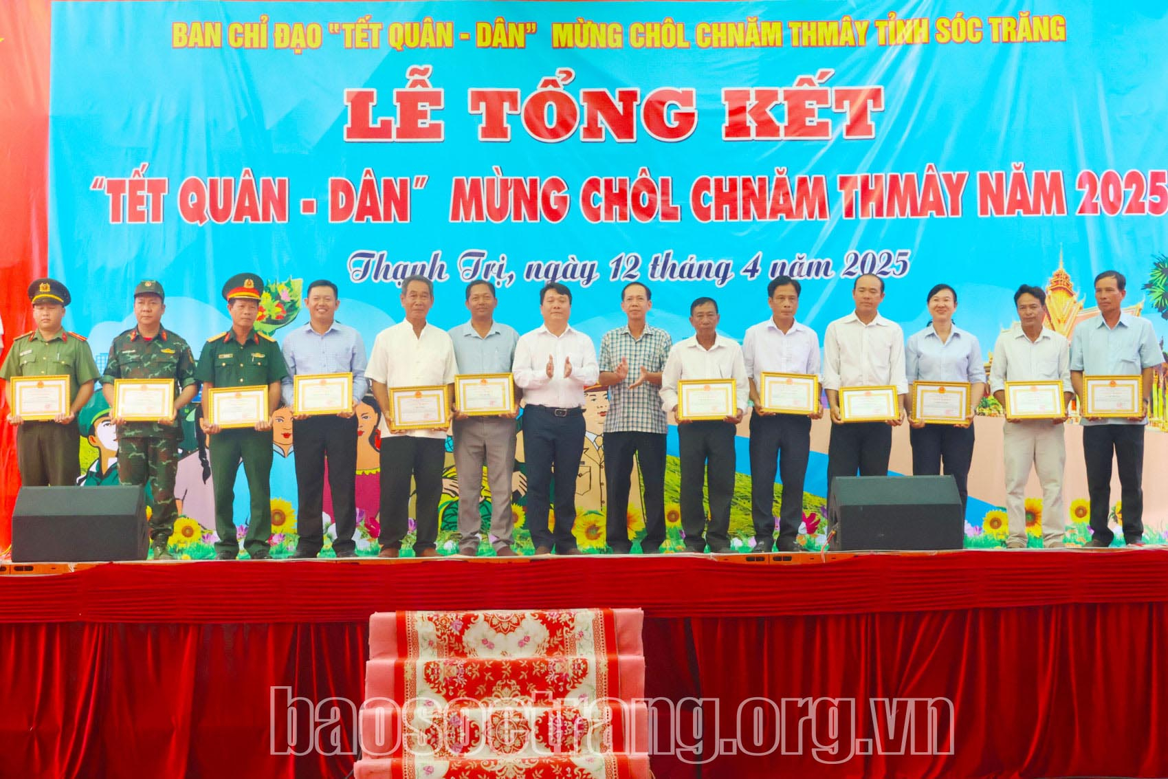 Dịp này, Ban Chỉ đạo Tết Quân - Dân còn tổ chức khen thưởng và biểu dương cho 30 tập thể và 40 cá nhân hoàn thành xuất sắc nhiệm vụ trong công tác tổ chức các hoạt động Tết Quân - Dân mừng Chôl Chnăm Thmây năm 2025.