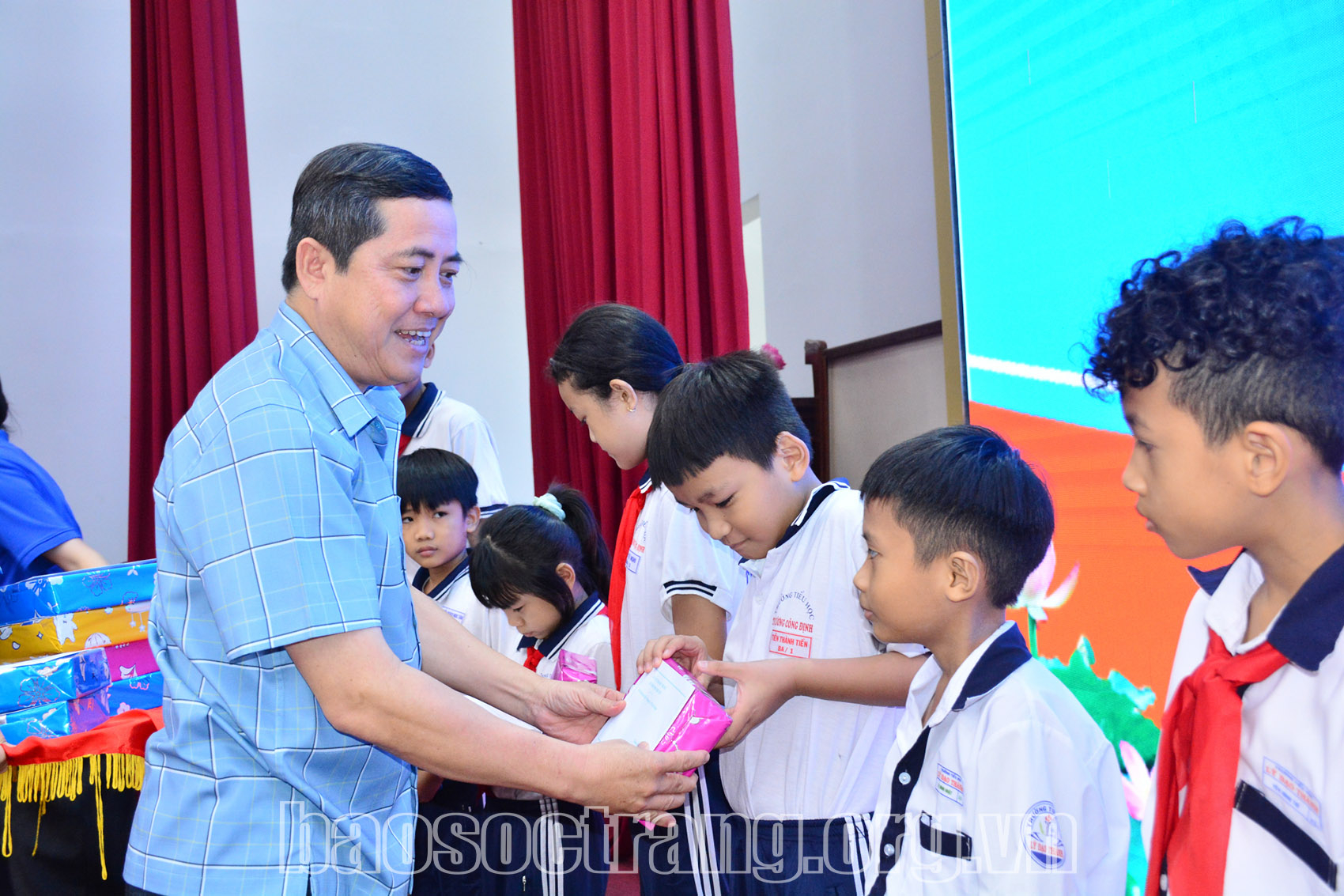 | Lãnh đạo các sở, ban, ngành tỉnh Sóc Trăng trao quà cho các em thiếu nhi. Ảnh: HOÀNG PHÚC |