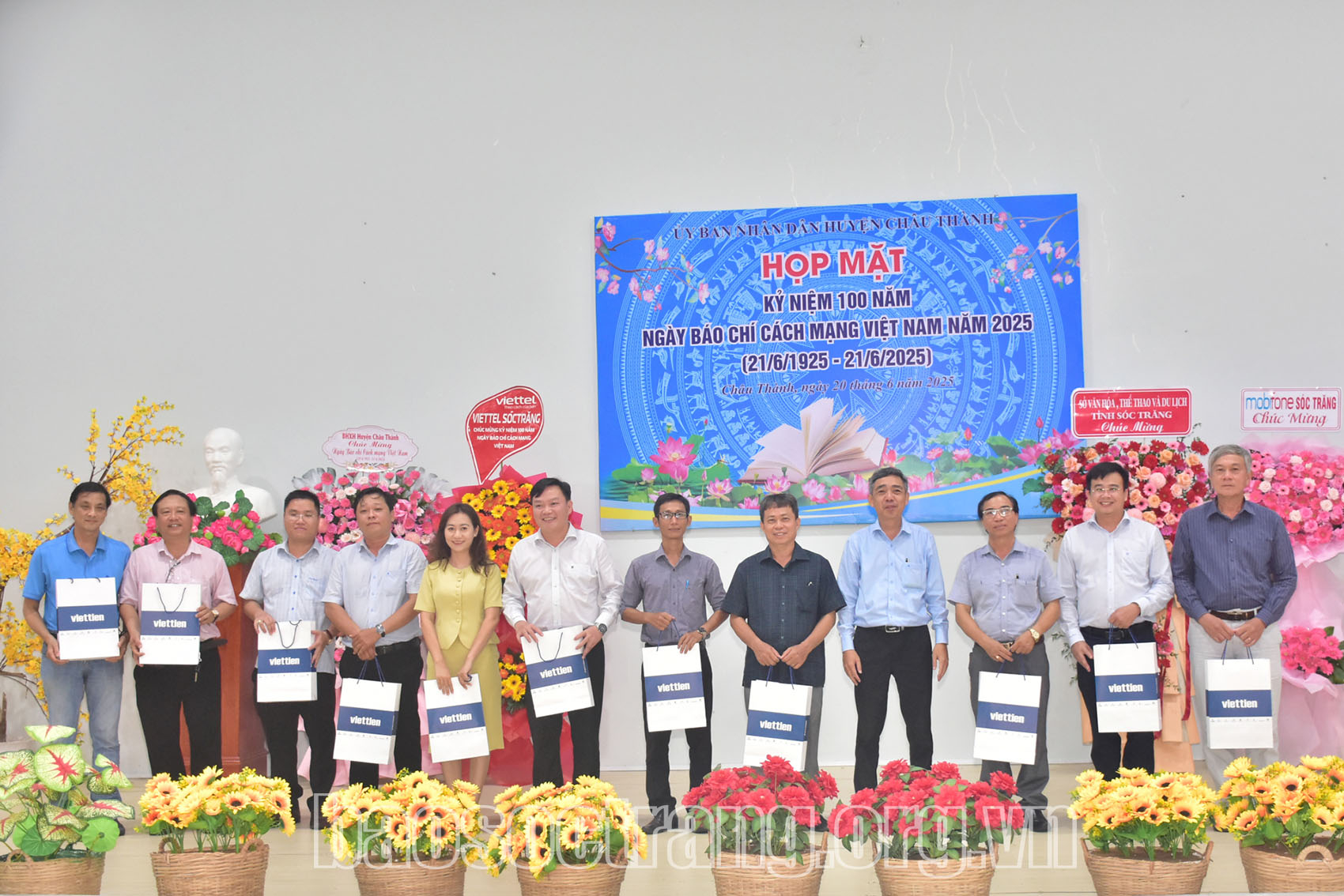| Lãnh đạo huyện Châu Thành (Sóc Trăng) tặng quà cho lãnh đạo cơ quan Báo và Đài Phát thanh Truyền hình Sóc Trăng và lãnh đạo Sở Văn hóa, Thể thao và Du lịch Sóc Trăng. Ảnh: THẠCH PÍCH |