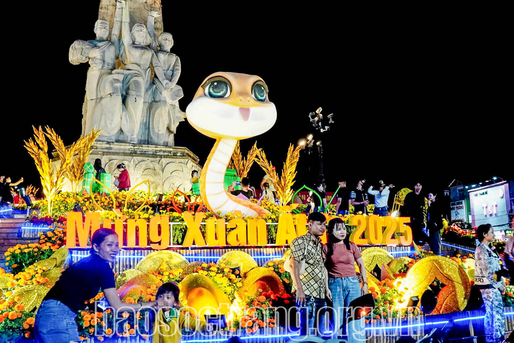 Từ đầu giờ tối, khu vực trung tâm thành phố đã trở thành điểm đến của hàng ngàn người dân đến tham quan. Những góc trang trí đậm sắc xuân thu hút đông đảo các gia đình và bạn trẻ đến chụp ảnh lưu niệm với linh vật rắn.