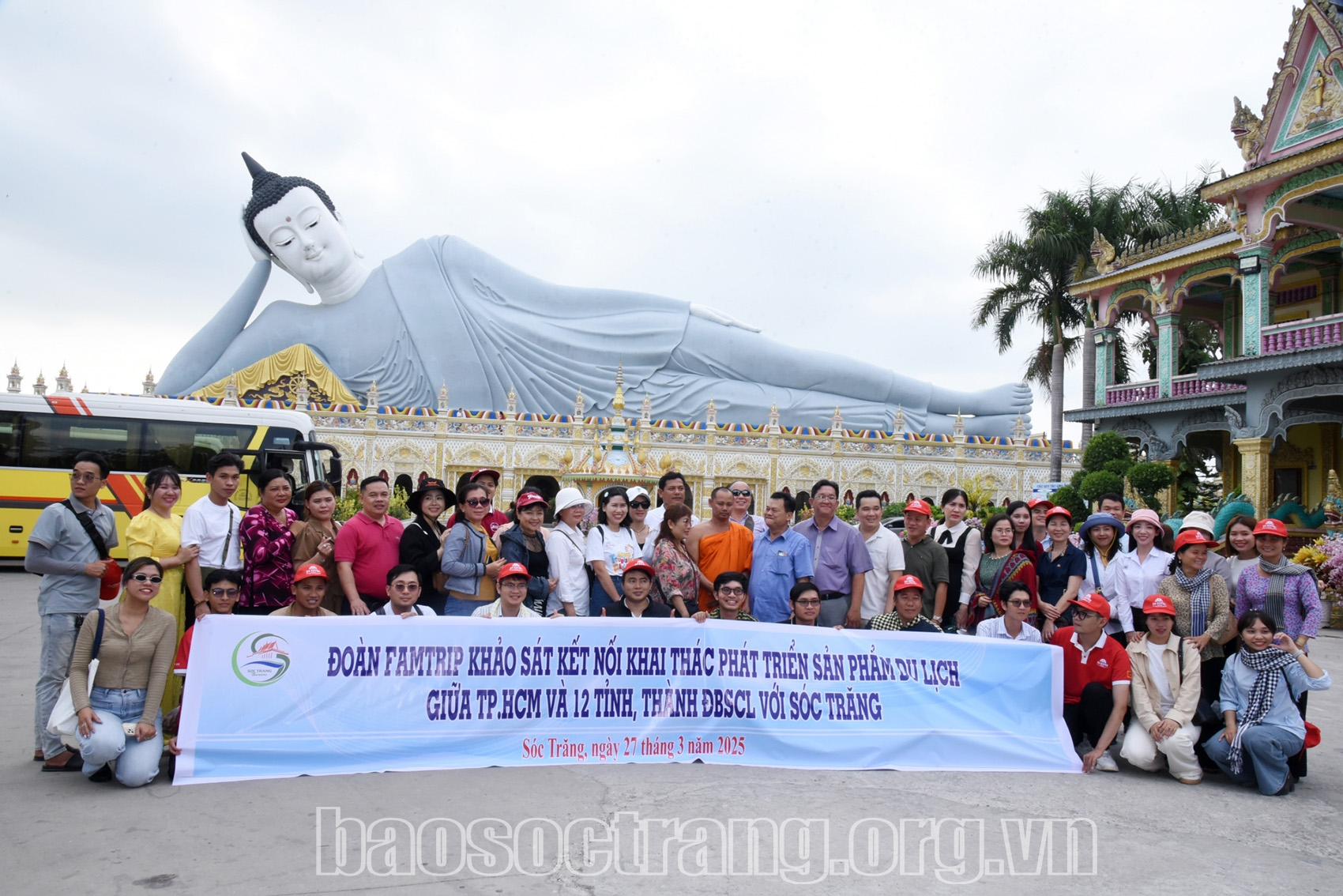 | Đoàn tham quan và chụp ảnh lưu niệm tại điểm du lịch chùa Bô Tum Wong Sa Som Rong, Phường 5, thành phố Sóc Trăng (Sóc Trăng). Ảnh: THẠCH PÍCH |