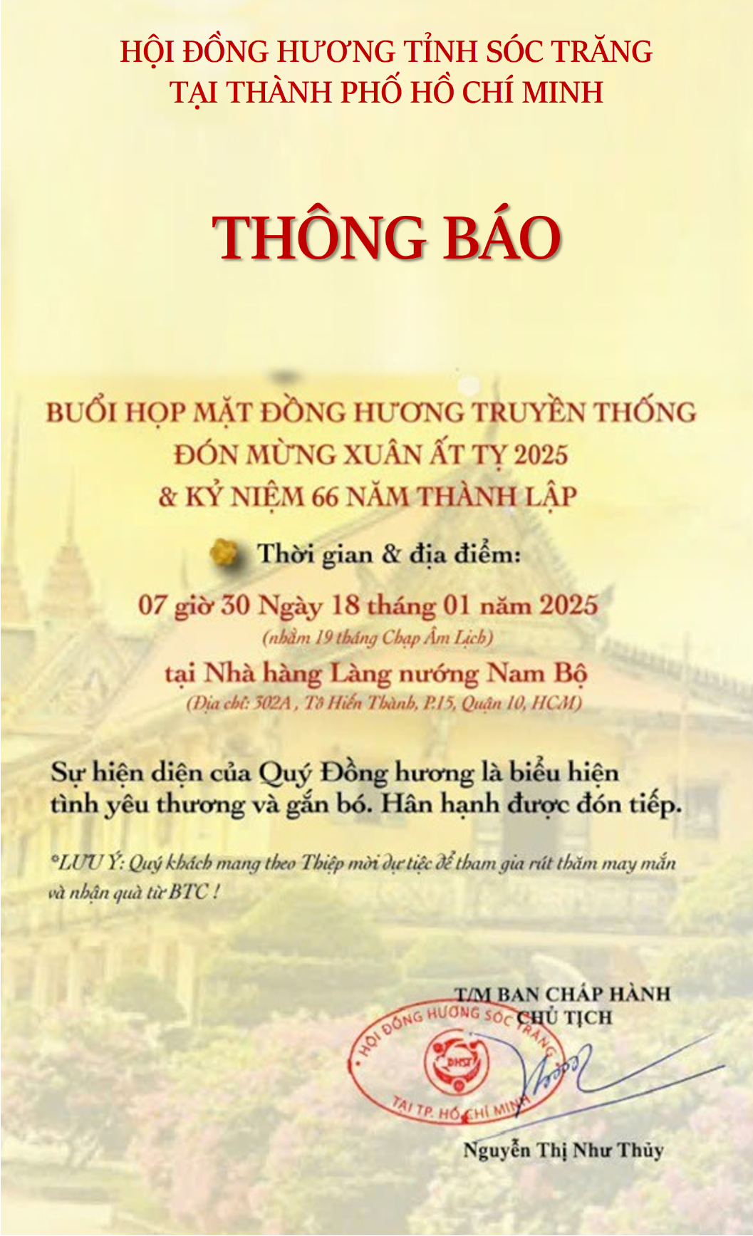 Hội đồng hương tỉnh Sóc Trăng tại Thành phố Hồ Chí Minh thông báo họp mặt