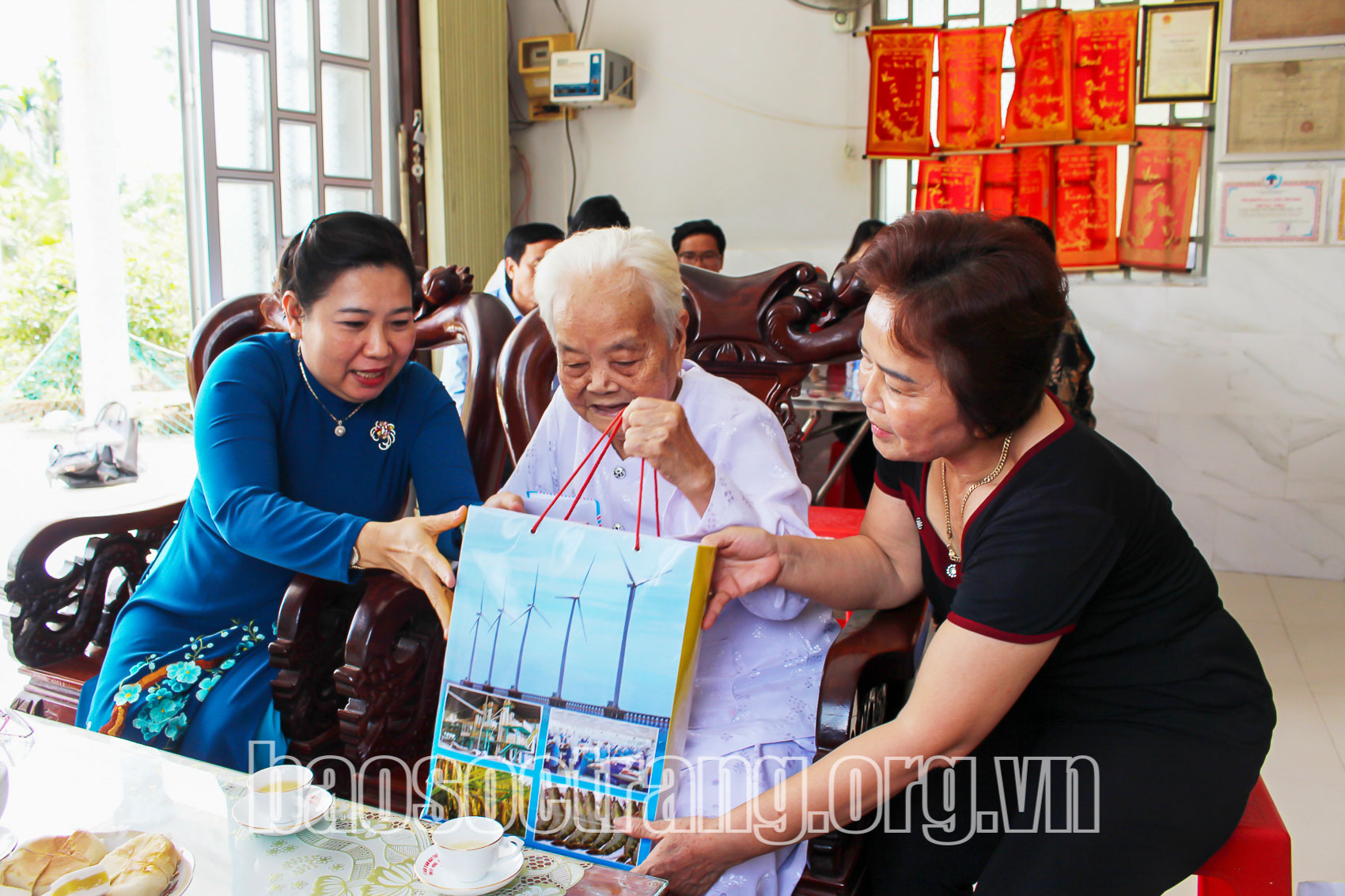 | Đồng chí Hồ Thị Cẩm Đào - Phó Bí thư Thường trực Tỉnh ủy, Chủ tịch HĐND tỉnh Sóc Trăng (bìa trái) thăm hỏi, trao quà cho Bà mẹ Việt Nam anh hùng Huỳnh Thị Nghĩa. Ảnh : SỚM MAI |