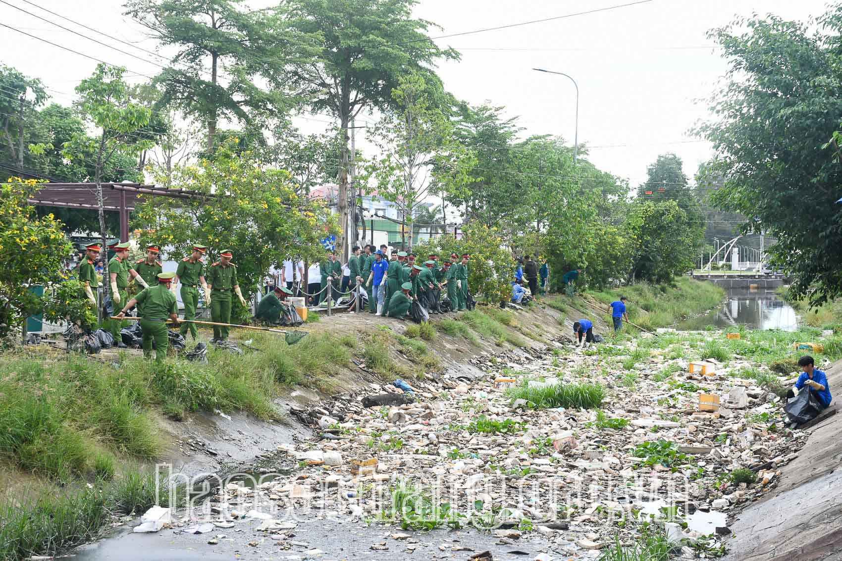 | Lực lượng vũ trang và đoàn viên, thanh niên trên địa bàn thành phố Sóc Trăng thu gom rác trên kênh Nhân lực. Ảnh: HẢI HÀ |